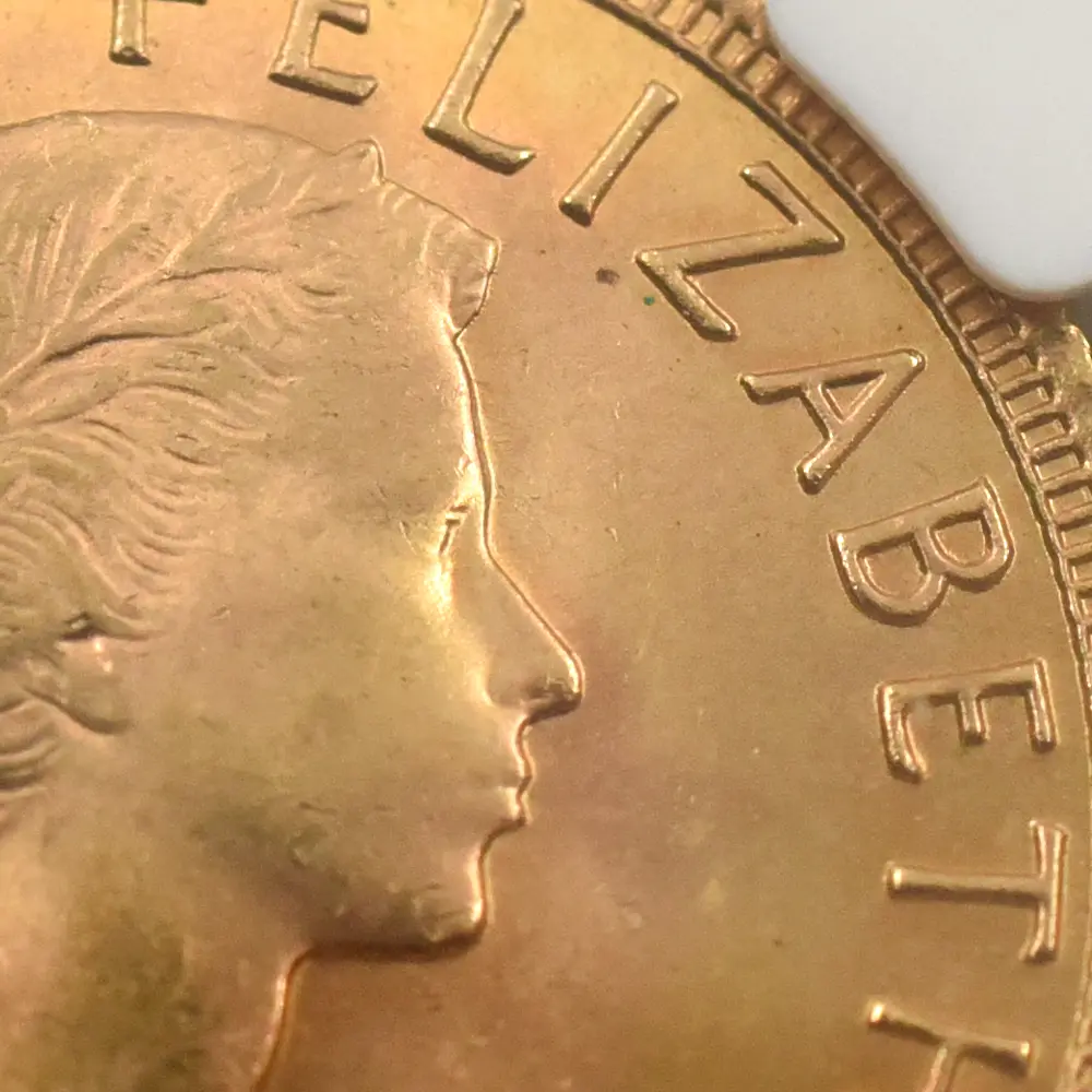 今回ご紹介させていただく作品の表面には、エリザベス2世の治世の幕開けを象徴する「ヤングヤング・エリザベス」が刻まれています。1950年代のロイヤルミントを牽引した女流コインデザイナー、メアリー・ギリックの独創性が光るこの作品は、20世紀の英国貨幣界を代表する屈指の大作として知られています。今回ご紹介させていただくコインの表面には、意気揚々たる趣きを湛えた若干25歳の女王の横顔が描写されており、若年にして英国を率いることになった女王の気概を感じ取ることができます。そしてコイン裏面に見られる「聖ジョージの竜退治」のデザインですが、19世紀初頭の英国貨幣界に君臨したイタリア人名彫刻家、ベネデット・ピストゥルッチ(1783年-1855年)入魂の力作として今日まで受け継がれてきた重要な作品です。馬上から悪の象徴であるドラゴンを退治する聖人の風格は、あらゆる苦難を乗り越えて国家を統治する君主の姿になぞらえることが可能かと思われます。エリザベス2世の治世と共に発行を開始したモダンコインの世界ですが、意外なことに女王の治世初期のコインに関しては各種カタログには掲載されているものの、近年のオークションを始めとする市場においては目にする機会自体がめっきり減ってしまったものも多く存在します。中でも1950年代に発行されたモダンコインの数々は、その稀少性において群を抜いています。当コインは1958年の作品ですが、モダンコインといえどもヴィンテージの風合いを醸し出す貴重な一枚でもあります。英国コインのファンが皆一様に憧れる「ヤングヤング・エリザベス」を掲げる当コインは、20世紀から21世紀にかけての英国に君臨した伝説の君主エリザベス2世の思い出に捧げられる、現代英国史の集約とも言える傑作です。