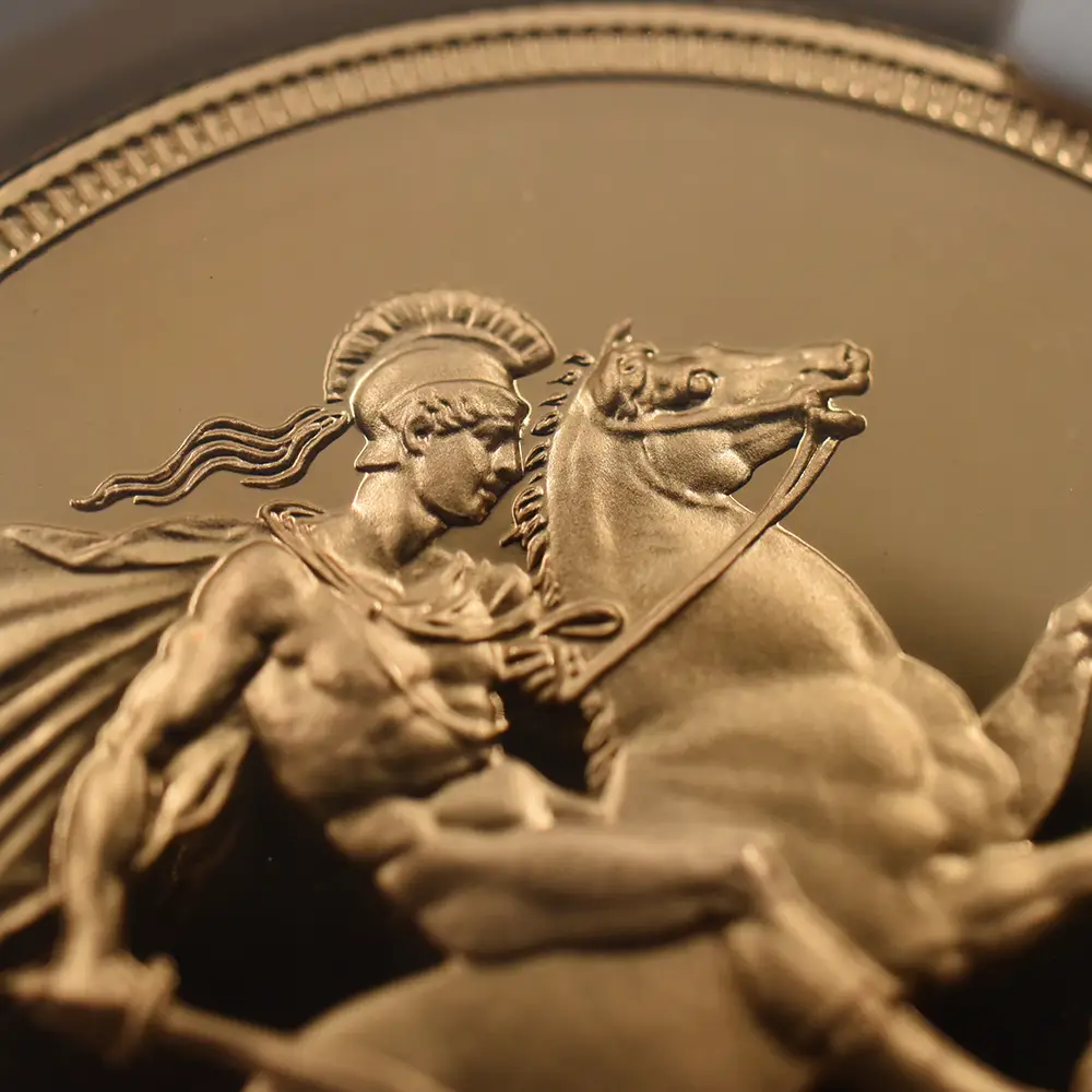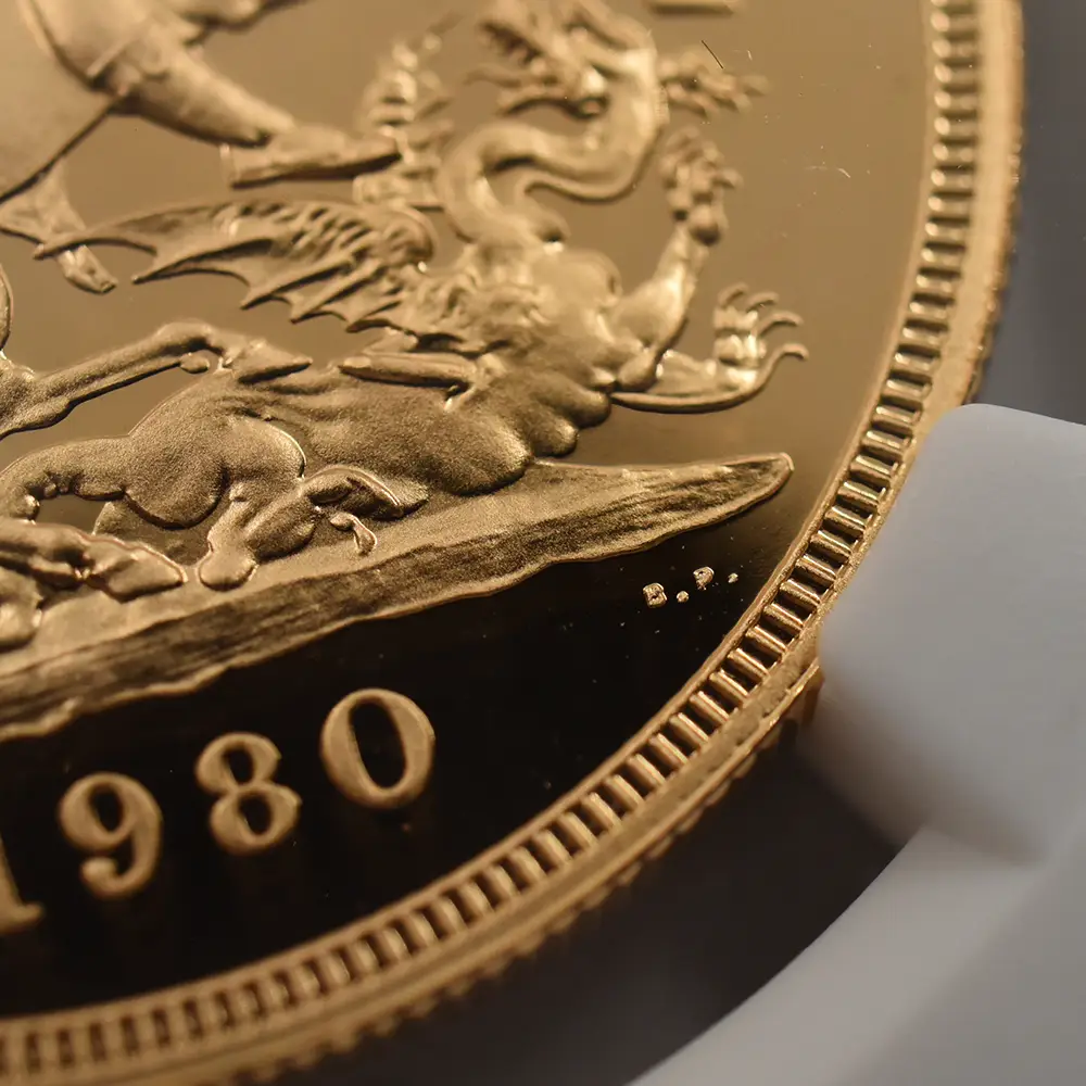 1980年から4年間(1983年度版のみ未発行)にわたって発行された英国女王エリザベス2世の治世を代表するこのソブリン金貨は、その稀少性と豊かな芸術性によって英国モダンコイン最大の人気作として不動の地位を築きました。その人気の源は表面に刻まれた英国女王エリザベス2世若き日の気品あふれる肖像で、1970年代のロイヤルミントを代表するコイン・デザイナーにして英国を代表する名彫刻家として名を馳せたアーノルド・メイチンの人生を代表する大作とされているものです。細長く引き伸ばされた胸部から頭部にかけての頸筋は、若くして大国に君臨する運命を担うことになったエリザベス2世の凛として美しくも気高いオーラを醸し出しています。女王の頭部を彩る宝飾品は「大英帝国とアイルランドの少女たち」という華麗な名を冠する英国王室屈指の名品で、女王お気に入りのティアラであることからメディアに映し出される機会の多いものでもあります。崇高な趣を湛えた女王の胸像の周囲には「神の恩寵によるエリザベス2世・女王にして忠誠の守護者」と厳かな文言が続きます。ジョージ3世の治世下に彗星の如く現れ、瞬く間にロンドンのコイン制作界の寵児となった稀代の才人ベネデット・ピストルッチ。その有り余る才能を駆使して生み出したのが英国コインの永遠のテーマである「聖ジョージの竜退治」です。この優れた意匠を裏面に描く当ソブリン金貨は、英国における伝統の継承がコイン界においても例外ではないことを証明して見せました。過去200年以上にわたり、国王の至高の王権の象徴として数々のソブリン貨の裏面を彩ってきたこの屈指の名作は、4年間にわたって発行されたエリザベス2世のためのソブリン金貨に捧げられるだけの正当性を併せ持つものです。馬に跨って敵対する悪の権化であるドラゴンを一撃の如く退治する聖ジョージの勇壮な姿は、全世界に広がるイギリス連邦を宗主として牽引し、全ての臣民の頂点に立つ馬上のエリザベス女王を想起させるものです。これらのコインのうち1981年と1982年に発行されたコインは特に希少性が高く、モダンコイン界において稀に見る限定的な発行枚数がこれら一連のコイン発行の付加価値となっている事実に驚かされます。初年度1980年の発行枚数は10000枚と若干多かったものの、翌年1981年度版は5400枚、さらに1982年度版に至っては2500枚しか発行されておらず、最終発行であった1984年度版の8000枚と比較するとその極端な希少性が浮かび上がってきます。しかしこれらの金貨の真価はその稀少性のみによって論じられる種類の物ではありません。どの時代にもその時代の顔と呼べる秀逸な金貨が必ず存在します。そしてこれらのソブリン金貨こそは、エリザベス2世の栄光の治世を恒久化するべく誕生した時代の顔として語り継がれて行くべき真の伝説に違いありません。
