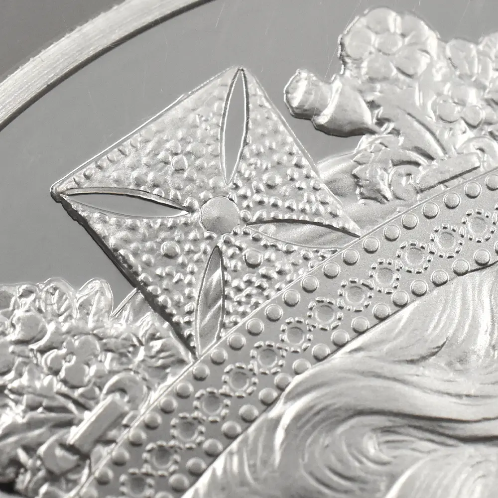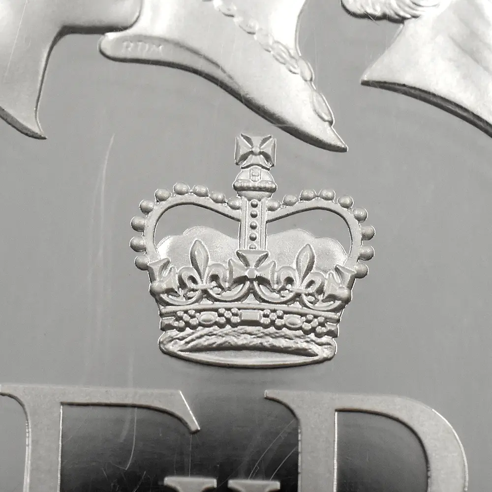 そしてコイン表面の期待の新肖像ですが、ロイヤルミントの実力派デザイナー、ジェームズ・バトラーならではの独創性豊かな新しいポートレートが、最長在位更新という記念すべき瞬間に相応しい威厳を表面全体にもたらし、成功を収めました。右向きの女王の肖像の頭上には、第3・第5肖像と同じく「ステート・ダイアモンド・ダイアデム」が見られ、深い感動を与えています。この空前絶後の秘宝は、1821年、時の国王ジョージ4世の戴冠式に合わせてロンドンの王室御用達ジュエラー「ランデル・アンド・ブリッジ」が制作したと伝えられている例外的な逸品です。当肖像の女王の横顔は、老年期に差し掛かっていた当時の女王の威厳を余すところなく表出しており、過去に制作されたどのコイン肖像と比較しても遜色がないばかりが、独特の心地よい重厚感を感じさせるものです。ここにモダンコインの最高傑作の一つが誕生しました。今や伝説上の人物と言っても過言では無いエリザベス2世ですが、君主としての女王をこれ程まで見事にコイン上に描いた作品はそう多くはありません。ロイヤルミントの傑出したコイン制作技術を証明する当コインは、同時に英国における君主制の未来永劫にわたる存続を希って世に送り出された奇跡的名貨に他なりません。
