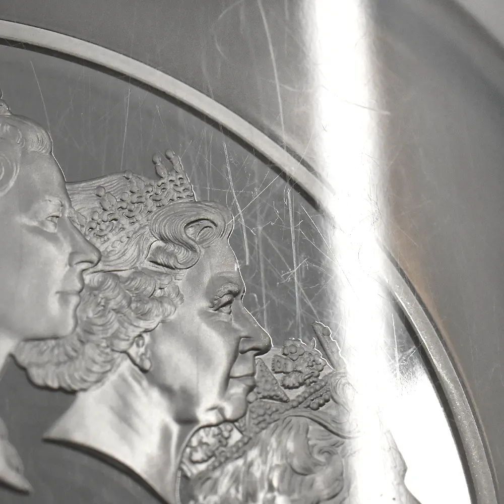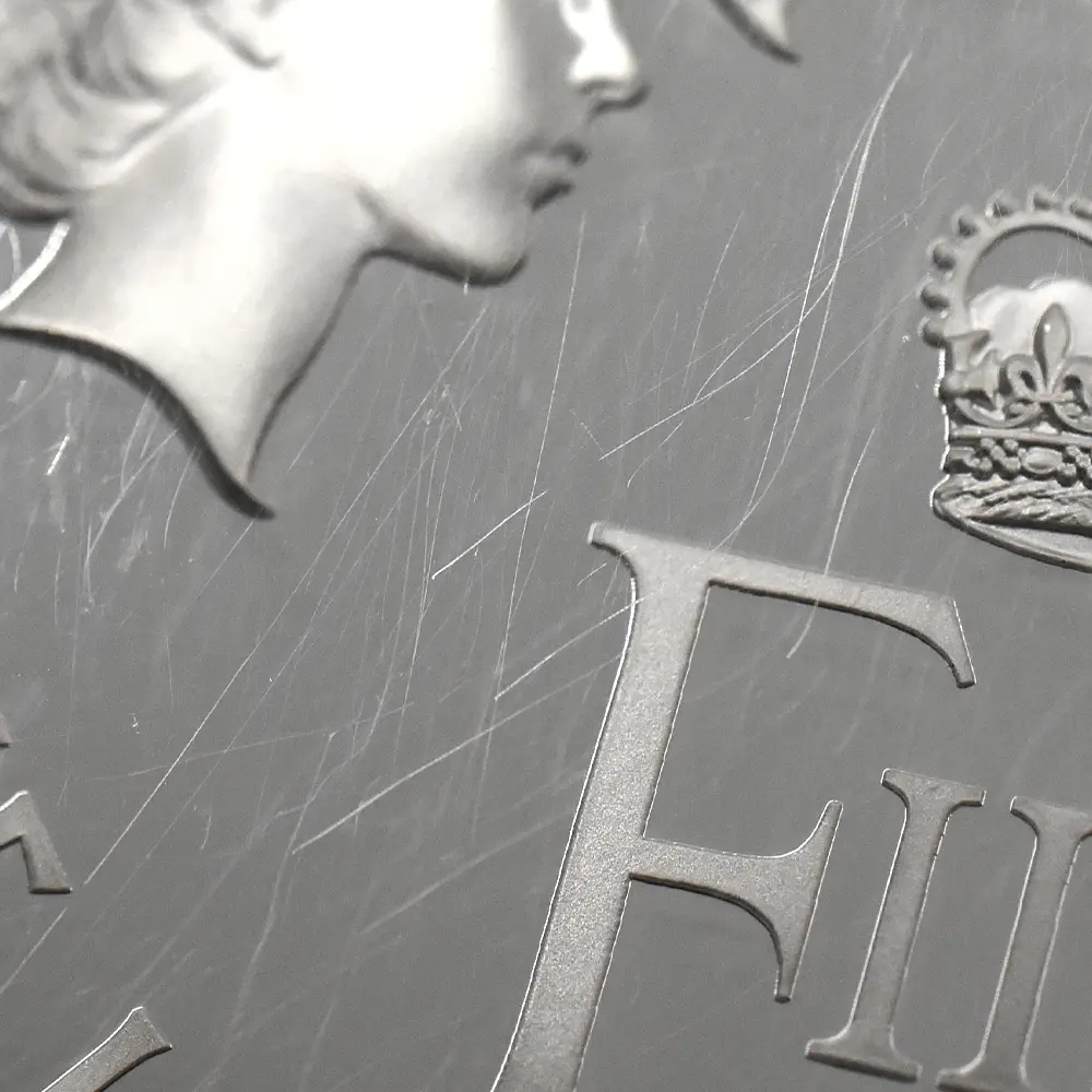 1953年に発表された通称「ヤングヤング」から、最長在位記録更新の年2015年にリリースされた「第5肖像」まで、エリザベス2世の全5種の公式コイン肖像を時系列で描く当コインの裏面は、基本的なアイデアは斬新ではあるものの、その描き方は実に写実的であり、それぞれの肖像を創造したデザイナーへの究極のオマージュとなっている点も見逃せません。左からメアリー・ギリック作の「第1肖像」、アーノルド・メイチン作「第2肖像」、ラファエル・マクロウフ作「第3肖像」、イアン・ランク・ブロードリー作「第4肖像」、そしてジョディー・クラーク作「第5肖像」、と半世紀以上もの歳月をかけて生み出された全公式コイン肖像の変遷を刻んでいます。