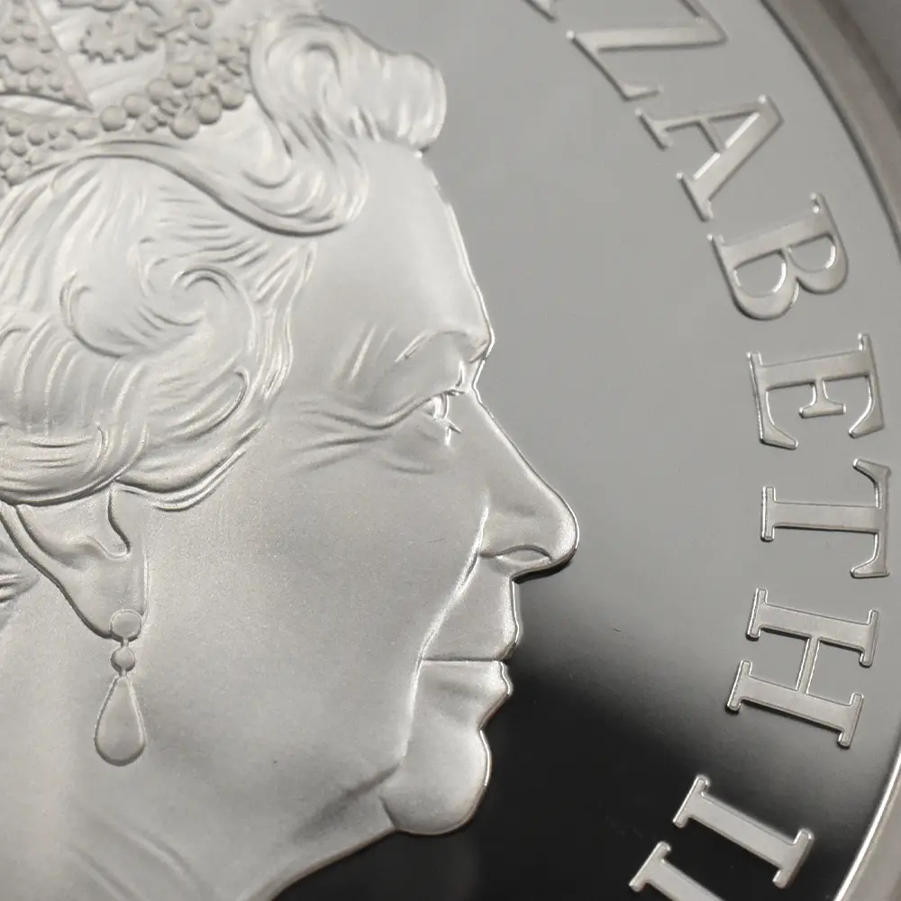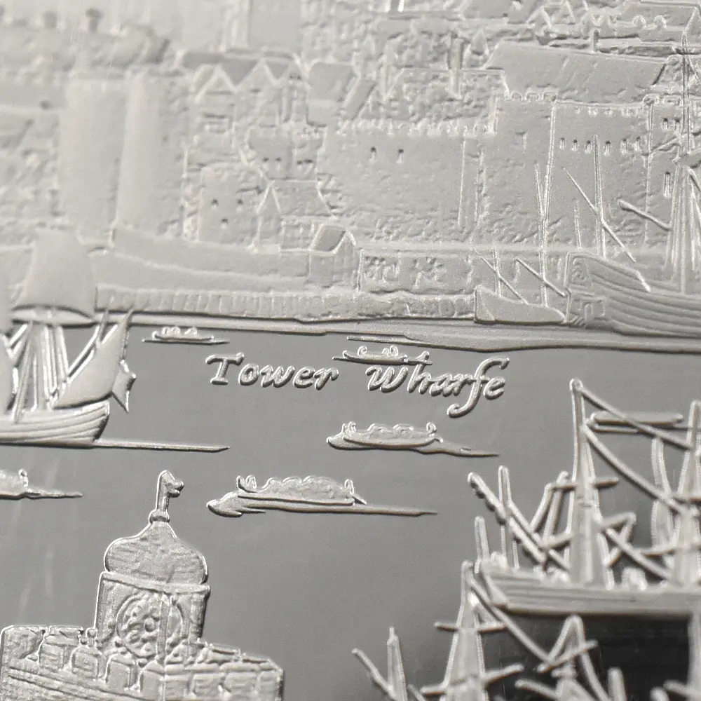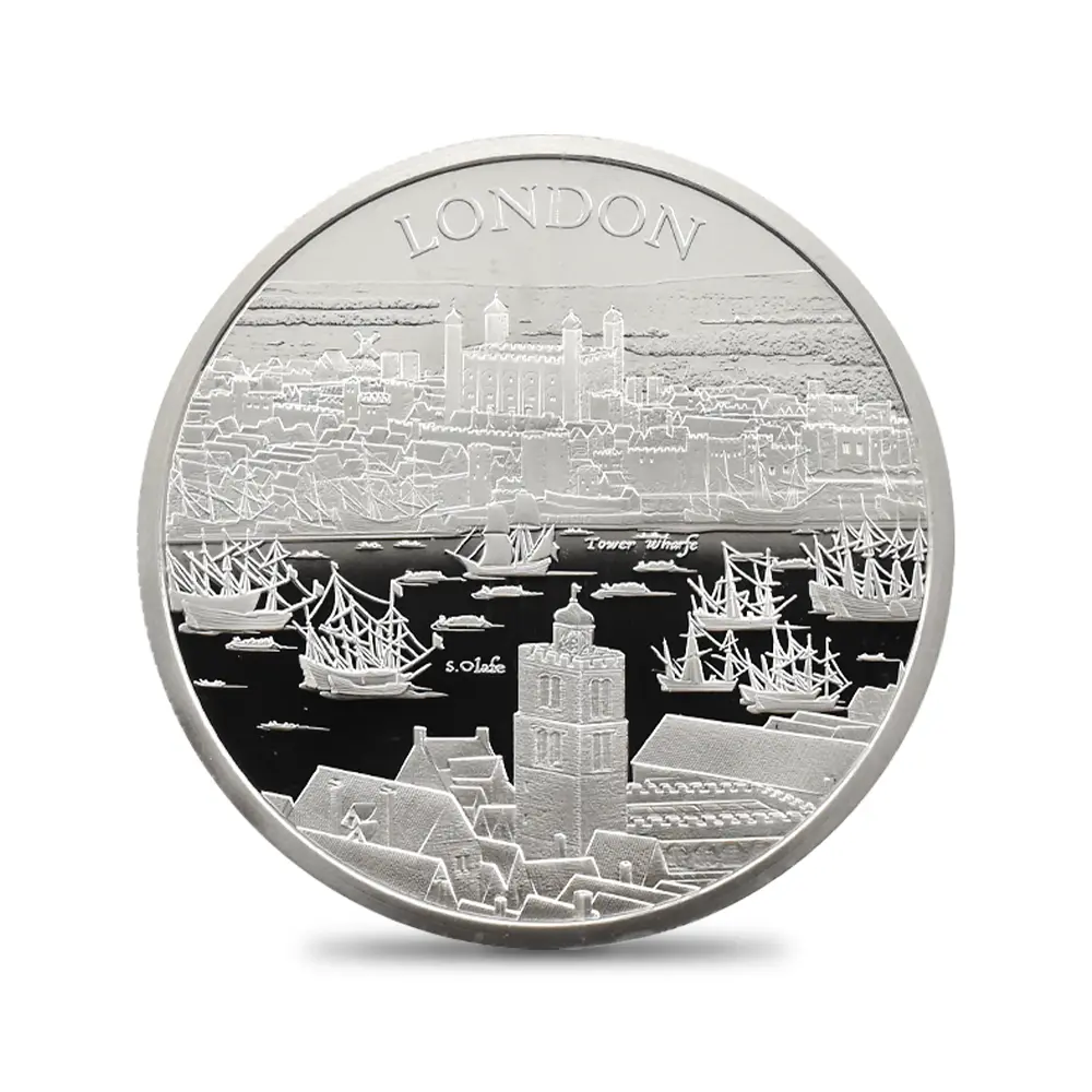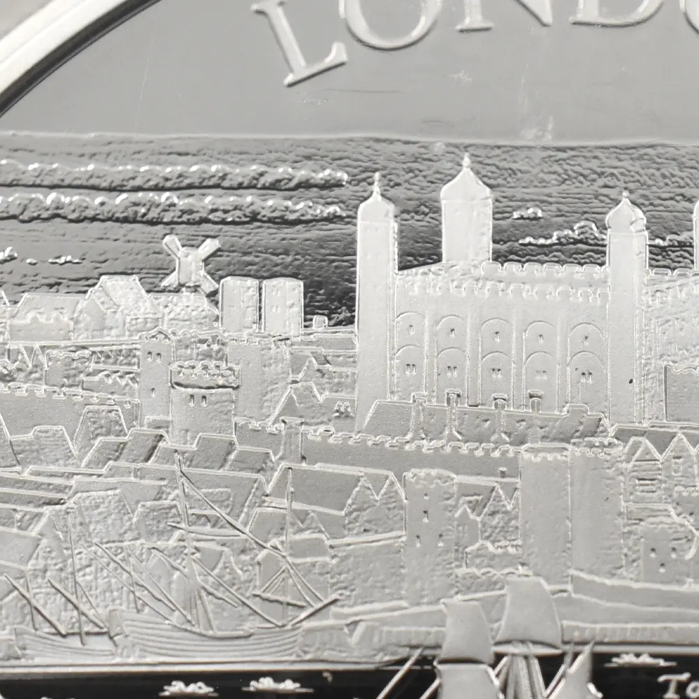 同コレクションの第1弾を飾るこのコイン裏面には、17世紀初頭のロンドンの世にも美しい景観が描かれています。テムズ川沿いに広がる見事な景色の魅力を伝えるこのデザインは、ステュアート朝の創設者ジェームズ1世の治世下のロンドンで頭角を現したボヘミア出身の芸術家、ウェンセスラウ・ホラーの風景画をオリジナルとしてコイン上に写し描いたものです。テムズ川の向こう岸には歴史的なロンドン塔の建築群が見えますが、中世期以降常にイングランド史の変遷を見続けて来たこの建物以上に同コレクションの第1弾に相応しい題材は無いことと思われます。都市を防御する要塞として誕生したロンドン塔ですが、その後、身分の高い政治犯の収監先として機能したため、その血なまぐさい記憶はイングランド史の負の遺産として現在に至るまで語り継がれています。1970年代以降ウェールズに居を構える英国ロイヤルミントですが、9世紀のアルフレッド大王の治世下に王自身によって設立されたとされる同ミントの発祥地としても知られるロンドン塔は、過去1000年以上にわたる英国貨幣鋳造の変遷を見届けて来ました。歴代王朝を代表するコインの殆どすべてがその敷地内で制作されたとされるロンドン塔は、英国アンティーク・コインの故郷であると言えます。現在もロンドンのランドマークとして全世界の注目を集めるロンドン塔を描く当コインは、未来の若い世代に受け継がれる真の文化遺産としての価値を持つものであり、英国の過去をその外観によってシンボライズしています。そしてコインの中央を流れるテムズ川の情景は永遠の首都ロンドンの悠久の歴史を物語っており、水運の歴史とともに発展を遂げた川と都市との繋がりを視覚化する優美なデザインは、コレクション価値を有する新コインシリーズの幕開けに相応しい独自性を窺わせるものです。さらにコイン表面には英国を代表する人物であるエリザベス2世の肖像が描かれていますが、ロンドンに生まれ、ロンドンと共に生きた女王のこの街に対する限りない愛情を感じさせる秀逸なポートレートが裏面の美しい景観との見事な調和を醸し出しています。当コインは、英国とその長大なる歴史をこよなく愛する真の英国コインファンに贈られるべき永遠の文化遺産に他なりません。