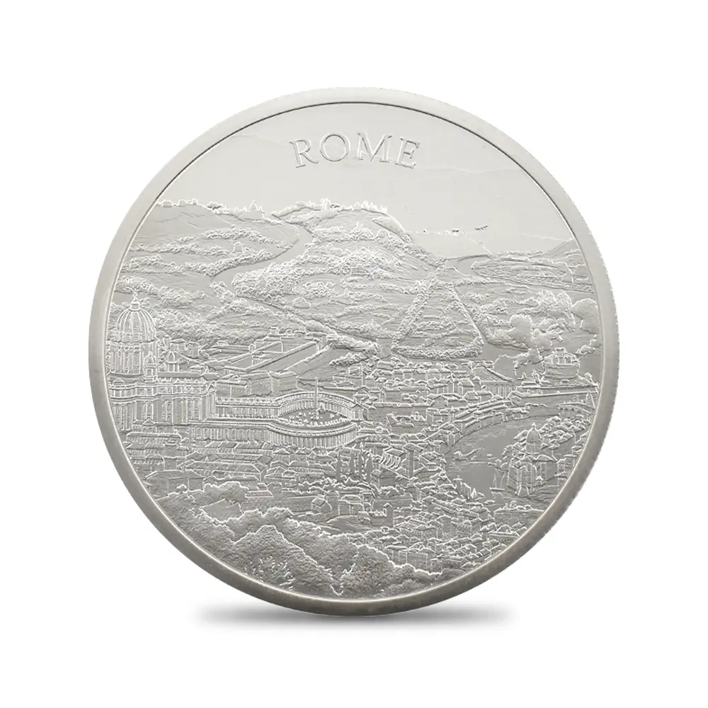 2022年の幕開けとともに英国ロイヤルミントが発表した「都市景観シリーズ」は、世界の歴史的な都市の景観をコイン裏面に描く画期的な企画です。その第1弾は、長年にわたってロイヤルミントの本拠地でもあり、歴史と文化の両面において常に世界的な注目を集めているロンドンの景観が取り挙げられ、絶賛を博しました。現在のイタリア共和国の首都として、政治、経済、文化、宗教の中心として機能し続けるローマの影響力は絶大であり、都市に囲まれるように存在するバチカン市国は、ローマ教皇の居住空間として存在するのみならず、全世界のカトリック教徒にとっての中心地でもあります。そして忘れてはならないことは、ローマがかつてヨーロッパ全域にわたって勢力を拡大していた古代ローマ帝国の首都であったことと同時に、今も西欧文化圏を代表する大都市の一つであるということです。歴史的な建造物を数多く有するローマは古くから観光地として栄え、その歴史を感じさせる美しさによって「永遠の都」と讃えられ続け今日に至ります。古代ローマの歴史は、紀元前753年ごろに始まったと伝えられており、ギリシャ神話の英雄アイネイアスの子孫、双子の兄弟ロームルスとレムスによって建設されたとされる伝説が残っていることから、彼らの名に因んでその後、「ローマ」と呼ばれるようになったとのことです。その後、諍いによってレムスを殺害したロームルスが初代の王を務めた王政期を経て、紀元前509年から50年の長きにわたって貴族と市民が共同で統治する共和政の時代を迎えます。しかし、紀元27年になり、共和政の崩壊と共に、その後、約500年間に及ぶ帝政の時代を迎えます。その安定した行政の下に、芸術文化が開花し、空前の栄華を誇ります。「全ての道はローマに続く」の格言通り、人類史上初の巨大帝国として発展を遂げた古代のローマは、その後、ローマ教皇の権威を盾とする繁栄を謳歌し、18世紀には一時的にナポレオン・ボナパルトの支配下にあったものの、ウィーン会議によってオーストリア帝国の支配下に置かれます。しかし1871年にはハプスブルグ家の支配から逃れ、ローマは名実ともに統一国家としてのイタリアの首都として再び脚光を浴びるに至ります。更に1930年代にはファシスト党のベニート・ムッソリーニ(1883年-1945年)の台頭によって、ローマは独裁政治に翻弄されることになります。第二次世界大戦での大敗によってムッソリーニの政権が崩壊した後、ローマは三度イタリアの首都として見事復興を果たし、その後のイタリア共和国の発展の基盤を構築し今日に至ります。