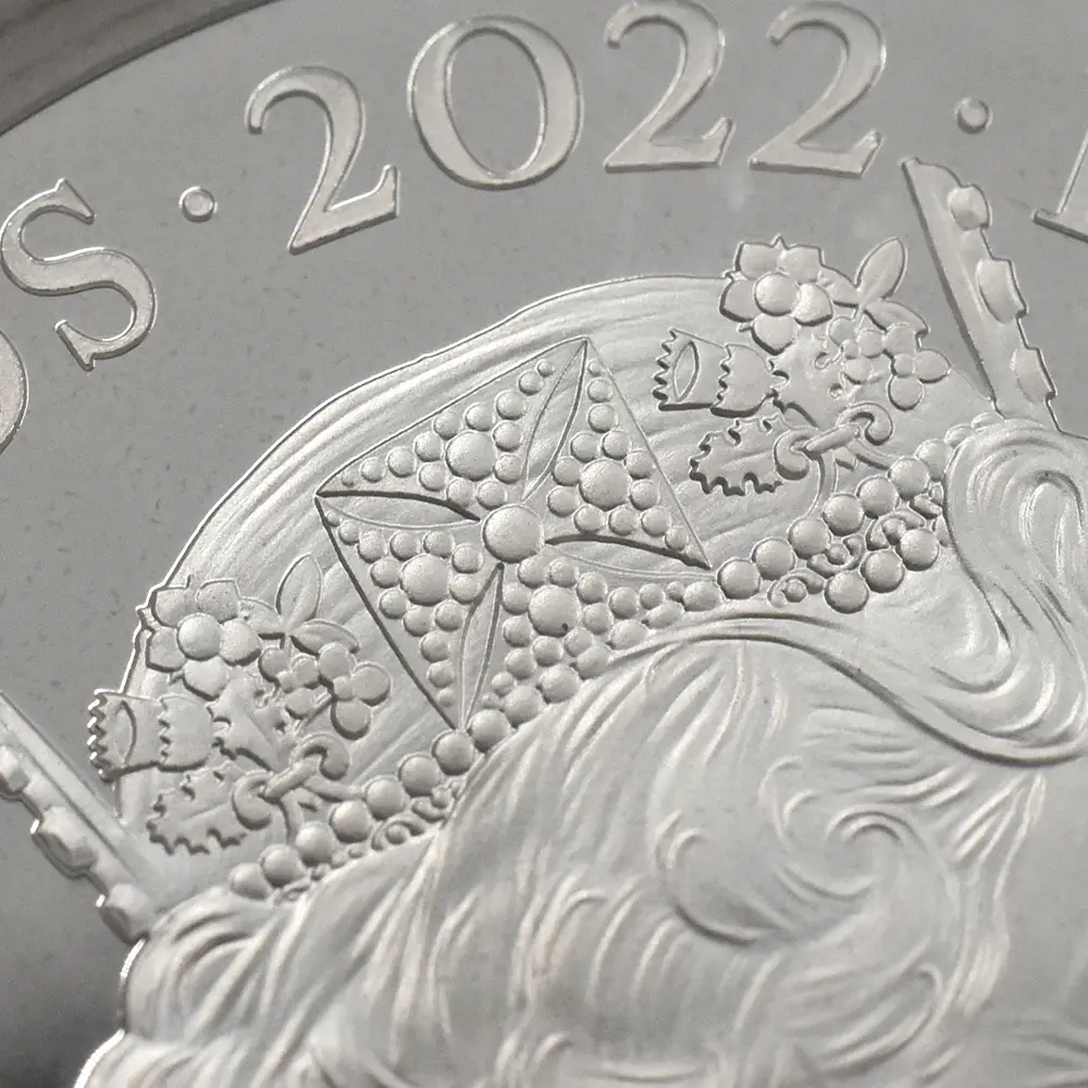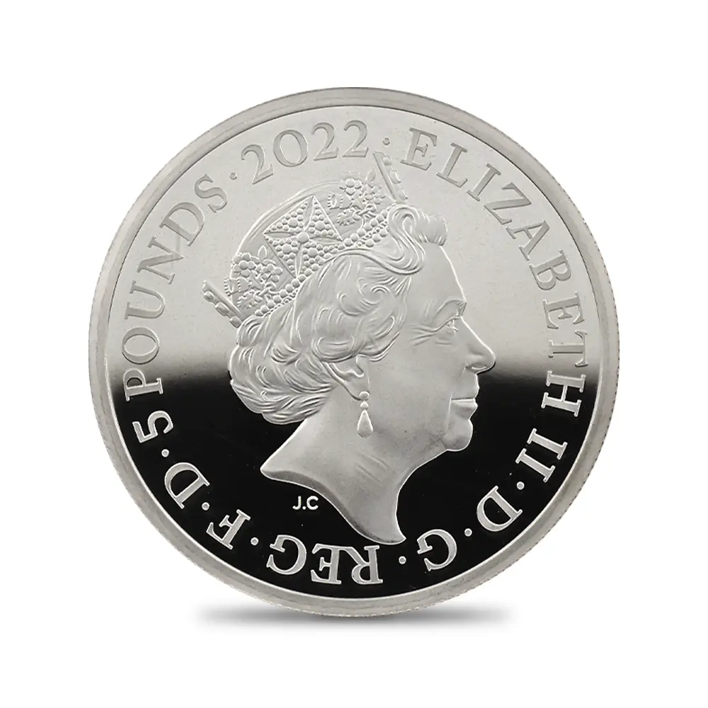 古代ローマ帝国の後裔として、これまで未曾有の発展を遂げ、今なお世界中の人々を魅了して止まないローマの多彩な特徴については語り尽くせないほどです。今回ご紹介させていただくコイン裏面のデザインは、19世紀初頭から中期にかけてパリを中心として活躍したフランス人銅版画製作者ジャック・アルフォンス・テスタール(1810年-18??年)が生前出版した「Aspect general de Rome」を元に復元されました。時は19世紀前半、未だ写真技術を持たなかった頃のヨーロッパにおいて、実在の風景の縮小版としての銅版画の出版は重要視されており、資料としても重用されていました。それ故に、この時代の同種の中には数多くの風景銅版画の傑作が散見されます。当コイン裏面に描かれた19世紀前半のローマ市街の鳥瞰図は、その悠久の歴史を感じさせるのどかな風景によって何度見ても飽きの来ないものです。今もバチカン市国のシンボルとして実在するサンピエトロ大聖堂を主軸とする威厳に満ちた都市景観は当裏面デザインのハイライトであり、歴史的に重要な建造物を含む都市景観を紹介することを主眼とする同コインシリーズの趣旨に沿って制作されたものでもあります。裏面には、2022年9月8日に惜しまれつつ崩御された英国君主エリザベス2世の気品に満ちた「第5肖像」が刻まれています。静謐感を湛えたその横顔は、在りし日の英国女王の人間味溢れる知性を浮き彫りにしています。今後も世界の偉大なる都市景観を続々と発表するはずの当コレクションですが、来年以降は新国王チャールズ3世のポートレートに切り替わる予定とのことで、同肖像が新規で発行される英国コインの表面を飾るのもあと僅かとなりました。当シリーズの記念すべき第2弾として発表された当コインは、全世界にとっての「永遠の都」であるローマの都市景観を多面的に描き出す秀逸な意匠によって、次作へと続く当シリーズの今後の方向性を一段と明確にしました。風景のみではなく、そこに漂う空気までをも再現し、観るものに深い感動を与える同シリーズの継続を心待ちにするばかりです。