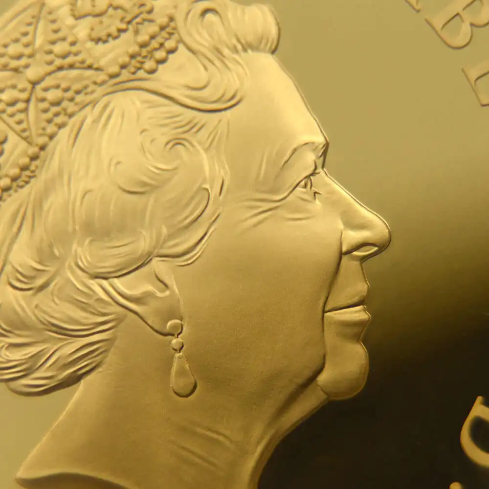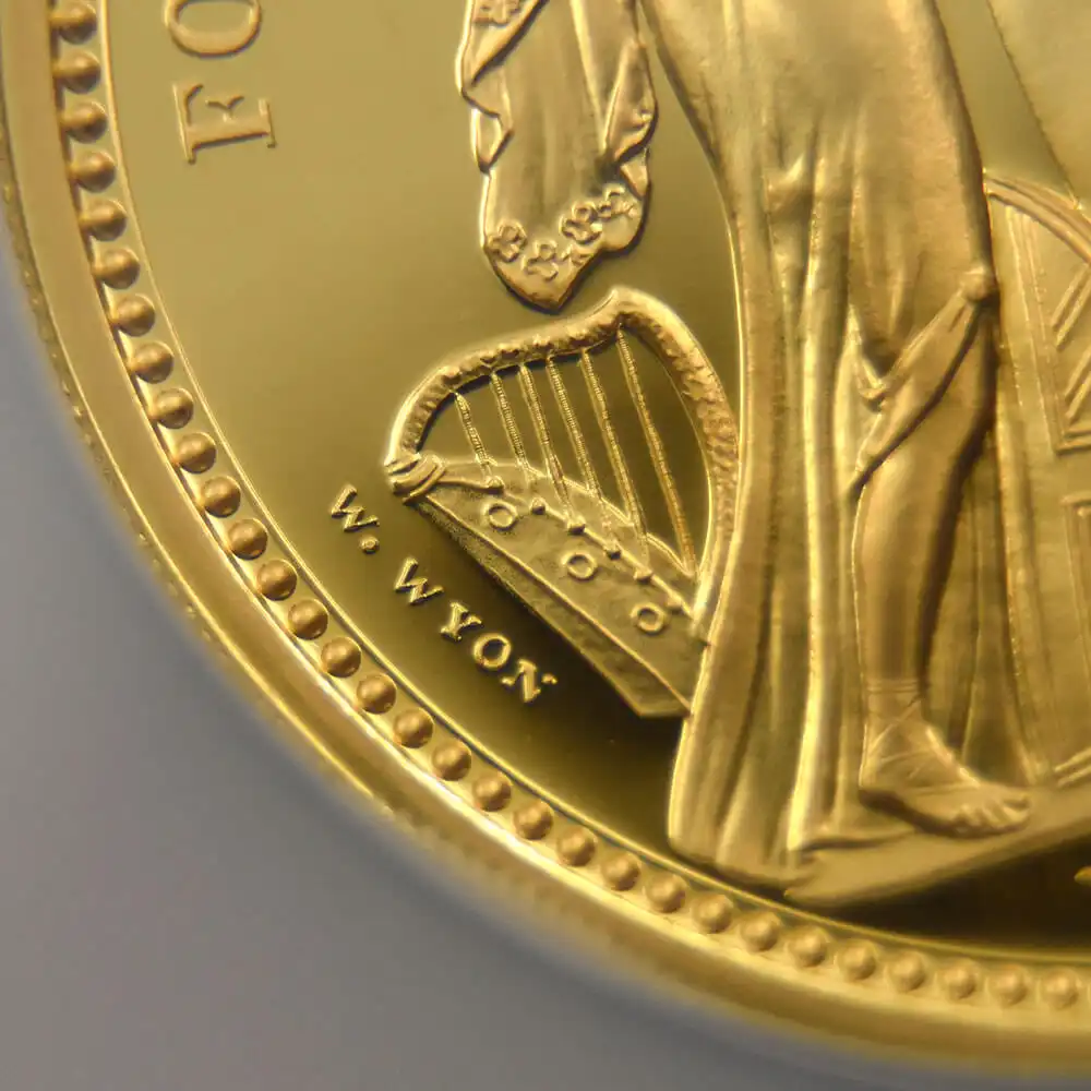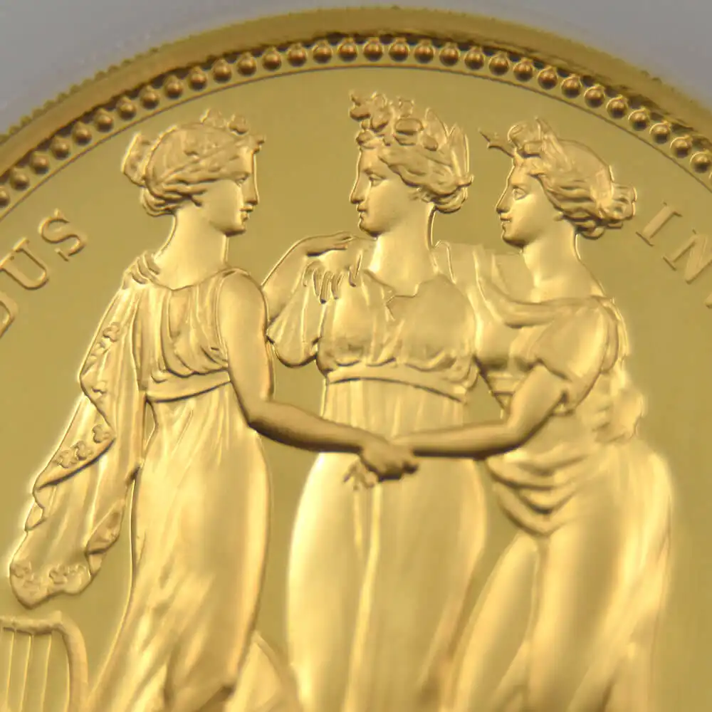 ウィリアム・ワイオンの代表作として名高い「スリーグレーセス」のデザインですが、2020年のロイヤルミントによるリマスター版の発行によってコインデザインの永遠の主題となりました。当金貨表面に刻まれているのはロイヤルミントの主力デザイナー、ジョディ―・クラークによるエリザベス二世の「第5肖像」です。緩やかに流れるような曲線を描く女王の白髪と深く刻まれた皺は、頭上のダイアモンド・ダイアデムの輝かしさを感動的に引き立てています。裏面の三美神はギリシャ神話の最高神ゼウスの娘達で、それぞれ若さ、歓喜、そして気品を象徴すると伝えられています。壮大なるギリシャ神話の世界を新古典様式の意匠によって再現する「スリーグレーセス」は、この度のリマスターによって21世紀の古典として受け継がれて行く永遠の生命を得ました。