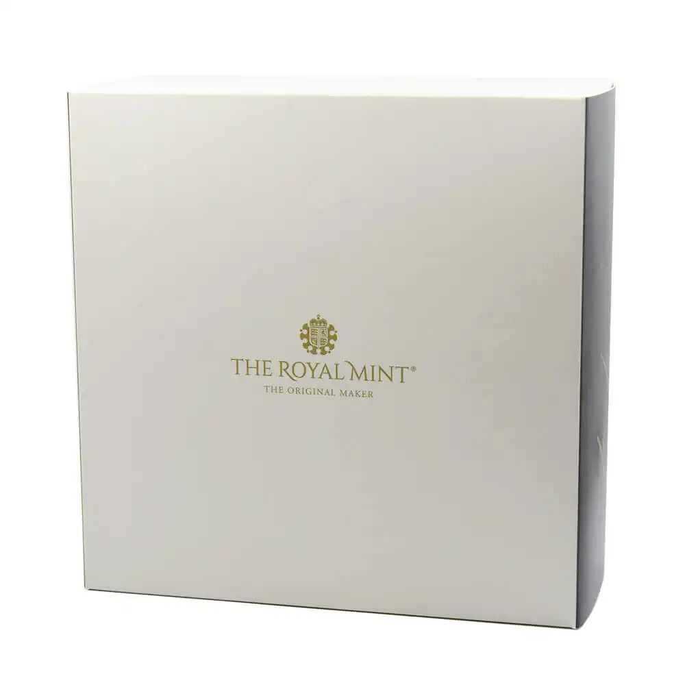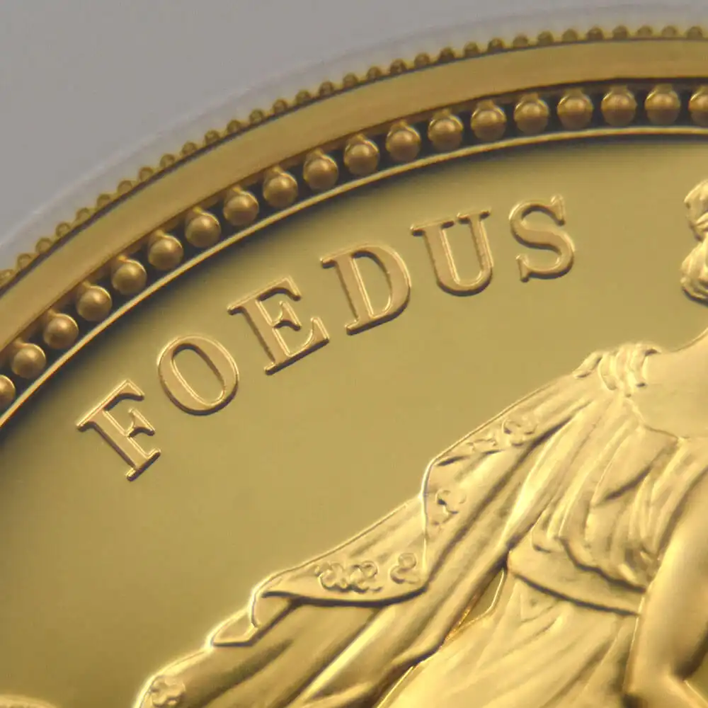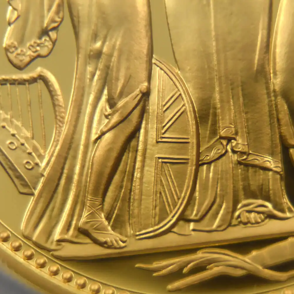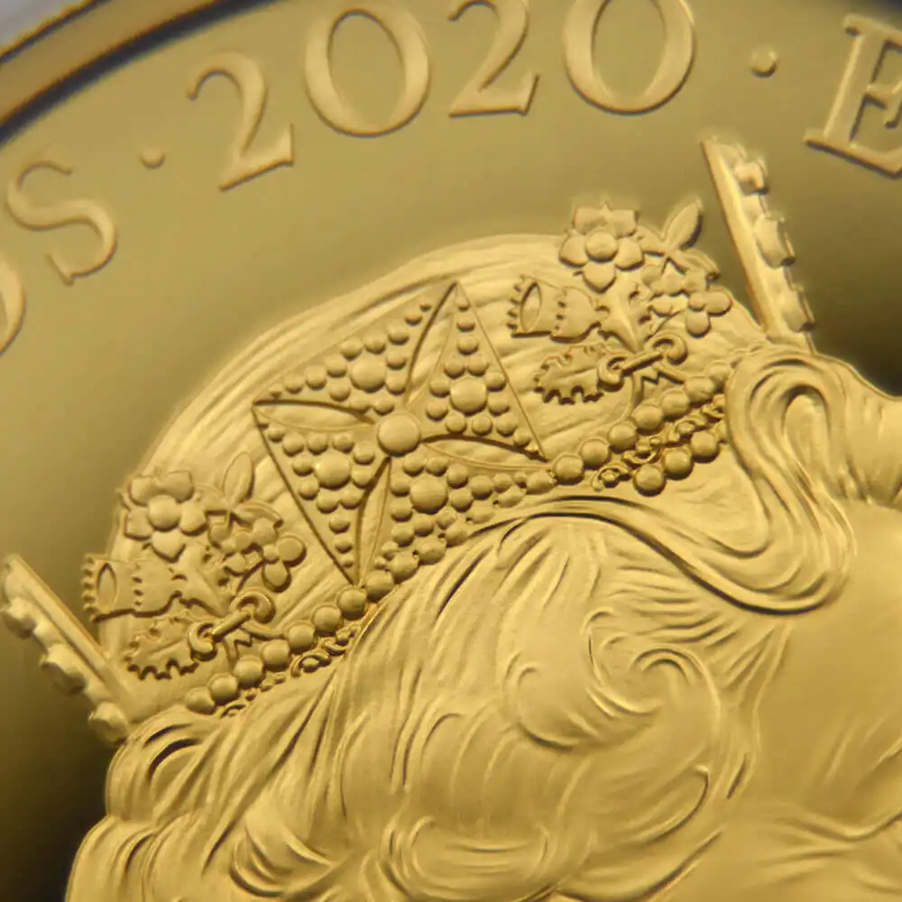 ウィリアム・ワイオンの代表作として名高い「スリーグレーセス」のデザインですが、2020年のロイヤルミントによるリマスター版の発行によってコインデザインの永遠の主題となりました。当金貨表面に刻まれているのはロイヤルミントの主力デザイナー、ジョディ―・クラークによるエリザベス二世の「第5肖像」です。緩やかに流れるような曲線を描く女王の白髪と深く刻まれた皺は、頭上のダイアモンド・ダイアデムの輝かしさを感動的に引き立てています。裏面の三美神はギリシャ神話の最高神ゼウスの娘達で、それぞれ若さ、歓喜、そして気品を象徴すると伝えられています。壮大なるギリシャ神話の世界を新古典様式の意匠によって再現する「スリーグレーセス」は、この度のリマスターによって21世紀の古典として受け継がれて行く永遠の生命を得ました。
