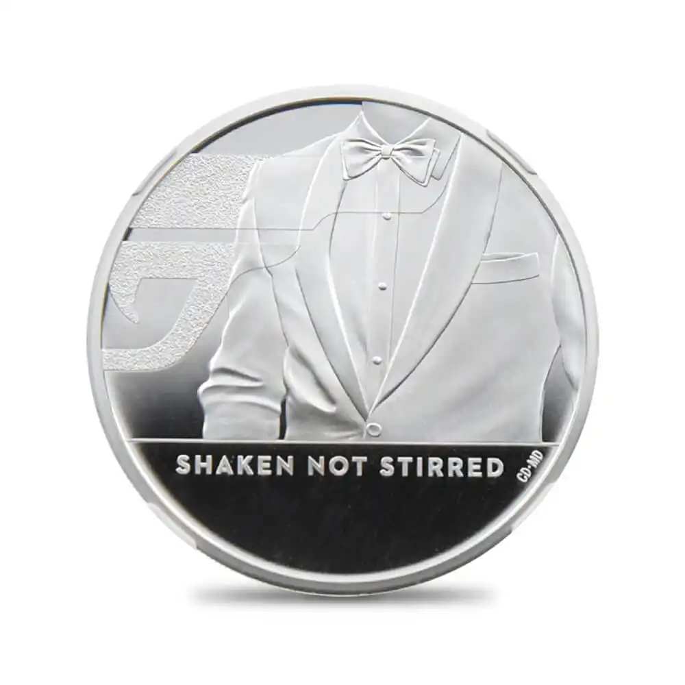 全24作からなる「007」シリーズは、過去50年以上に渡りスパイ・アクション映画の代表作として空前の成功を収めてきました。過去6人の異なる俳優によって演じられた主役ジェームズ・ボンドの肖像は作中のみならず、真の英国紳士の象徴として愛され続けています。「007」のこれまでの成功に祝意を込めて贈られるロイヤルミントによるこのコインは3種の連作の第3弾に相当し、3つを横に並べると007の数字を読み取ることが出来る遊び心豊かな名品です。コイン裏面に描かれているのは颯爽たるタキシード姿の主役ジェームズ・ボンドです。数々のボンド映画において白のタキシードを纏って登場し、ボンドのトレードマークとなりました。当コインは過去最高の人気を博した全ボンド映画を称賛すると共に、スクリーン上で常にエレガントな英国紳士であり続けた永遠のジェームズ・ボンド像に捧げられるものです。