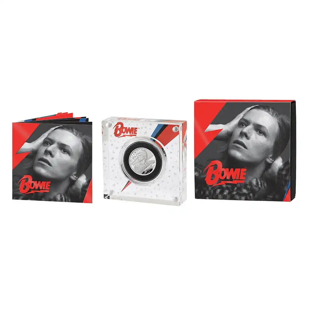 当1ポンド・プルーフ銀貨に描かれているのはデビュー当時の若々しいボウイの美しい姿です。反抗的なアバンギャルド精神を掲げつつも、 どこか古典的な美に対する憧憬を胸に秘めた不思議なオーラを放つボウイですが、そんな彼の芸術性が十二分に表現されているのが当銀貨です。 それは半世紀を超える長き年月に全世界を股にかけて試行錯誤を繰り返した飽くなき美の変遷で、ある一人の優れた英国人の理想の具現をも表現しています。 そしてそれは普遍的な英国人の本質でもあり、このコイン発行をもって永久に称えられるべきボウイの勝利となりました。色彩感溢れる鋭角的なデザインのケースの中に彼の魂は眠っています。