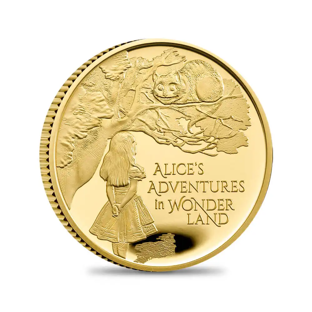 コイン裏面には不思議の国(ワンダーランド)に舞い降りた少女アリスと木の上にうずくまるチェシャ猫の絶妙な対話シーンを描く見事なイラストが刻まれています。「ここではみんなおかしいのさ」言い残して木の上から忽然と姿を消す不思議な猫とアリスの対話の瞬間を見事に捉えた当コインのデザインは、この奇想天外なる物語の深奥を余すところなく表現する秀作です。初版発行の際に著者キャロルとの共同作業を体験した画家ジョン・テニエルのスタイリッシュなデザインは、その物語性と英国的ユーモアのセンスを同時に表現する意欲溢れる傑作で、観る者を決して飽きさせることがなく物語に引き込まれる思いがします。