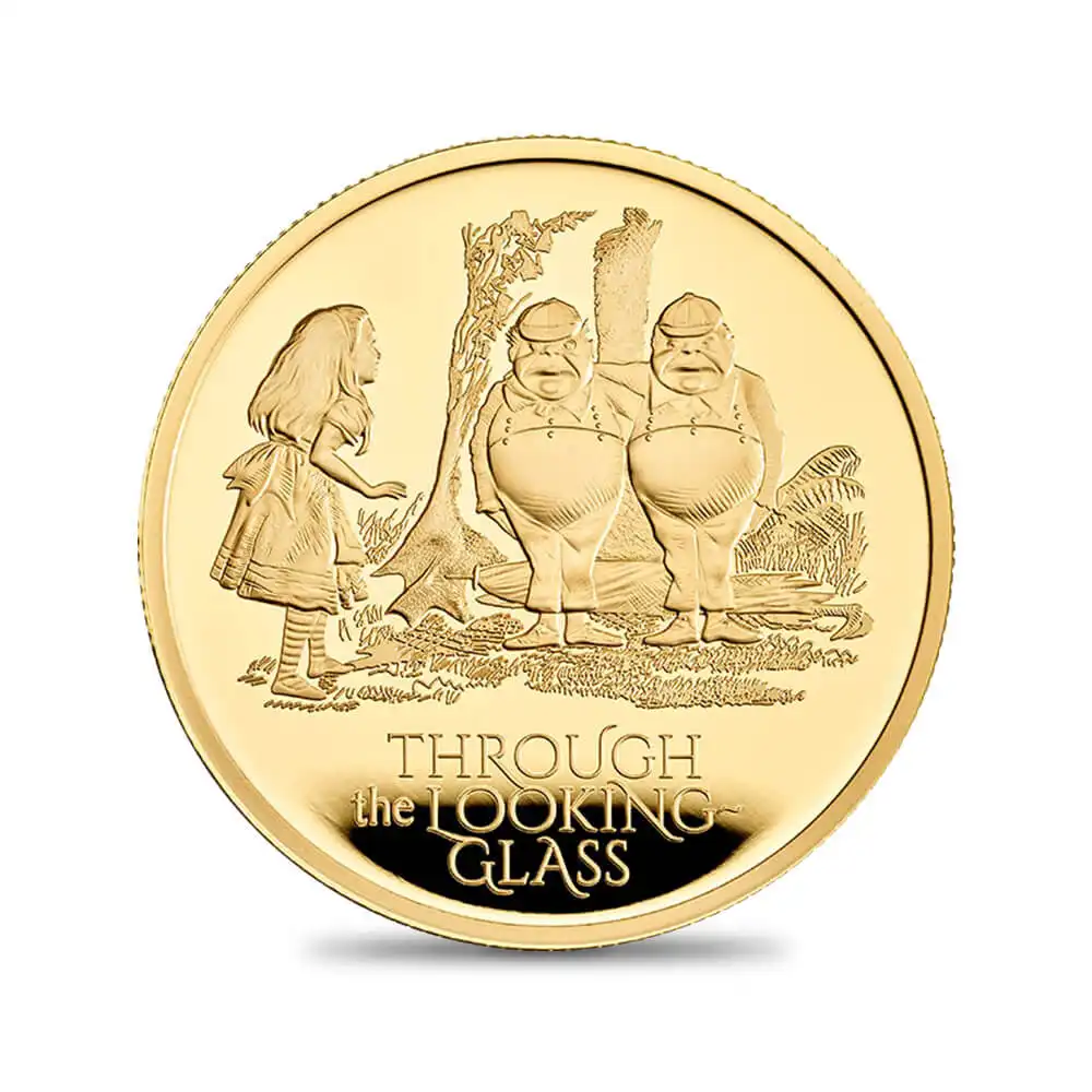 2021年最大の話題となること間違いなしの当コインセットは、アリスにまつわる2つの物語の名場面を描く2枚の美しいコインが収められているデラックスバージョンです。まず最初のコインですが、木の上にうずくまっているチェシャ猫とアリスの出会いの瞬間と対話を描く印象的なシーンが描かれています。「ここではみんなおかしいのさ」と謎の言葉を残してその場から消え去る猫の存在感にアリスが圧倒される名場面です。2枚目のコインには、英国の童謡「マザー・グース」によって知られる「トゥイードルダムとトゥイ―ドルディー」が取り挙げられています。双子の兄弟のような人物がおもちゃのガラガラを巡って争うという滑稽な内容の歌で、今日でも「トゥイードルダムとトゥイードルディー」は互いに争いながらも、実際にはよく似ている2人の人物を指す言葉として用いられています。森で道に迷ったアリスが森から出る道を聞くために2人を訪問する場面が象徴的に描かれています。