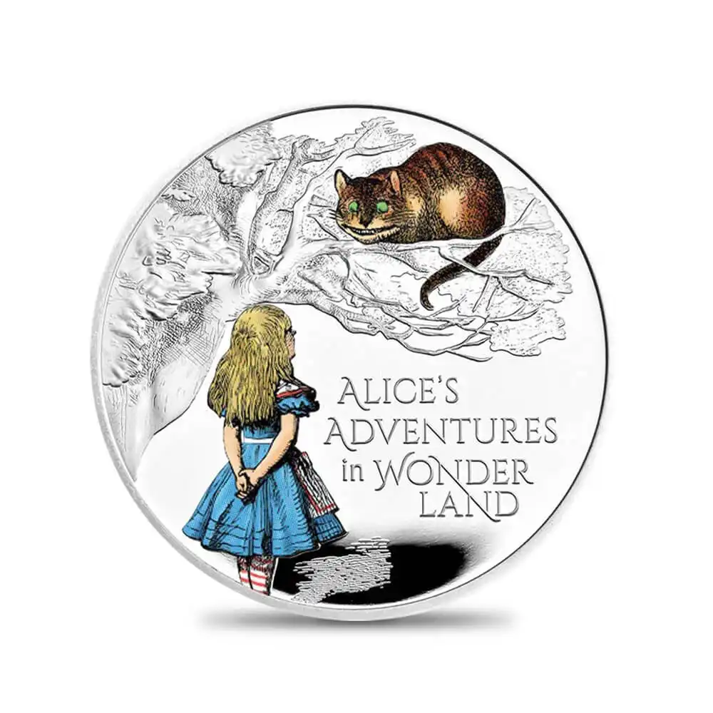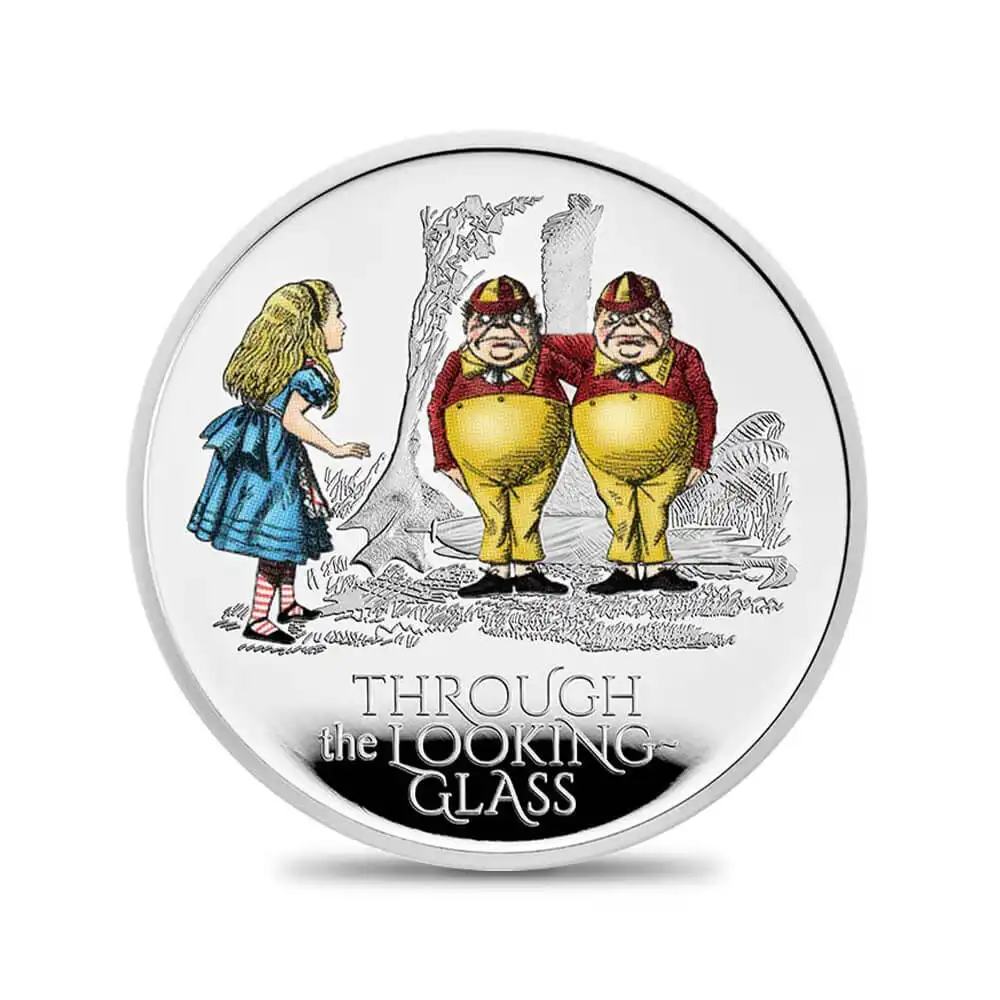 2021年最大の話題となること間違いなしの当コインセットは、アリスにまつわる2つの物語の名場面を描く2枚の美しいコインが収められているデラックスバージョンです。まず最初のコインですが、木の上にうずくまっているチェシャ猫とアリスの出会いの瞬間と対話を描く印象的なシーンが描かれています。「ここではみんなおかしいのさ」と謎の言葉を残してその場から消え去る猫の存在感にアリスが圧倒される名場面です。2枚目のコインには、英国の童謡「マザー・グース」によって知られる「トゥイードルダムとトゥイ―ドルディー」が取り挙げられています。双子の兄弟のような人物がおもちゃのガラガラを巡って争うという滑稽な内容の歌で、今日でも「トゥイードルダムとトゥイードルディー」は互いに争いながらも、実際にはよく似ている2人の人物を指す言葉として用いられています。森で道に迷ったアリスが森から出る道を聞くために2人を訪問する場面が象徴的に描かれています。