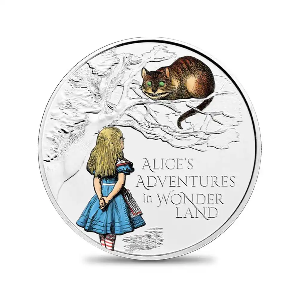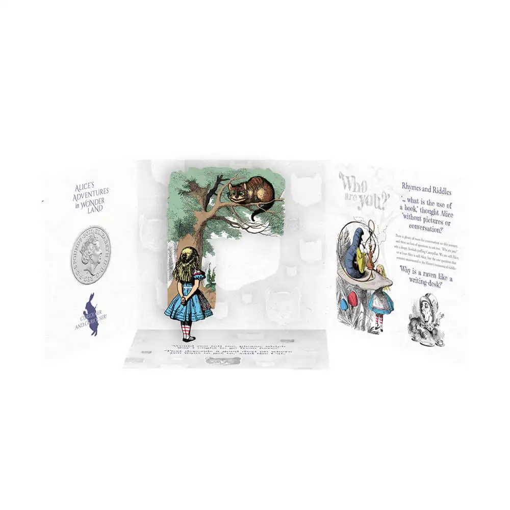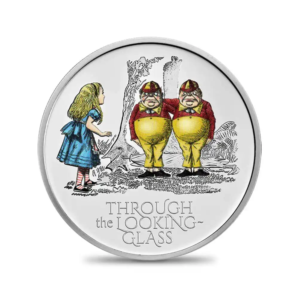 2021年最大の話題となること間違いなしの当コインセットは、アリスにまつわる2つの物語の名場面を描く2枚の美しいコインが収められているデラックスバージョンです。まず最初のコインですが、木の上にうずくまっているチェシャ猫とアリスの出会いの瞬間と対話を描く印象的なシーンが描かれています。「ここではみんなおかしいのさ」と謎の言葉を残してその場から消え去る猫の存在感にアリスが圧倒される名場面です。2枚目のコインには、英国の童謡「マザー・グース」によって知られる「トゥイードルダムとトゥイ―ドルディー」が取り挙げられています。双子の兄弟のような人物がおもちゃのガラガラを巡って争うという滑稽な内容の歌で、今日でも「トゥイードルダムとトゥイードルディー」は互いに争いながらも、実際にはよく似ている2人の人物を指す言葉として用いられています。森で道に迷ったアリスが森から出る道を聞くために2人を訪問する場面が象徴的に描かれています。