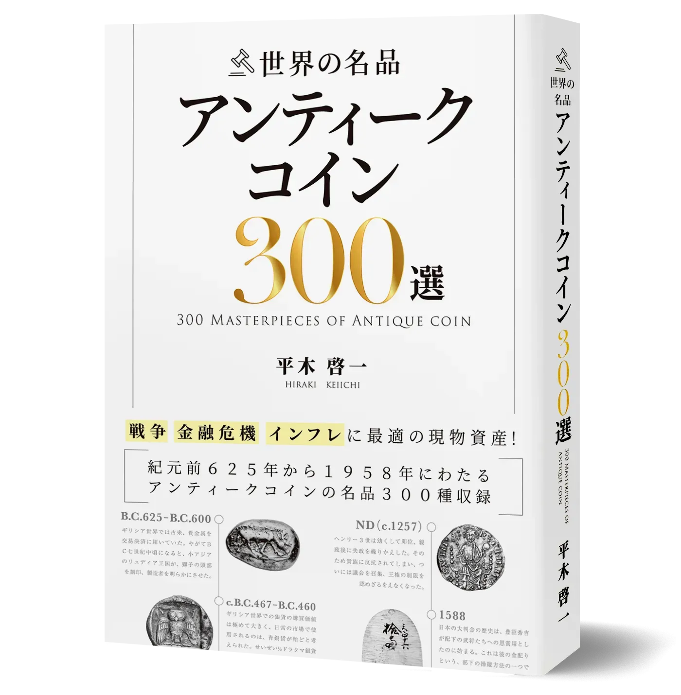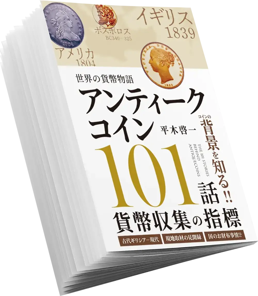 多種多様な切り口からコインや紙幣がテーマごとにまとめられ、101話のエピソードとして紹介されております。 各話に数点の名品が登場するものもあることから、1冊全体を通して登場するコイン・紙幣はなんと225点近くにものぼります。 さらに、「世界の貨幣物語 アンティークコイン101話」の最大の魅力は、なんといっても著者である平木先生個人の体験や、コインに対する考えがふんだんに盛り込まれているところです。