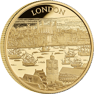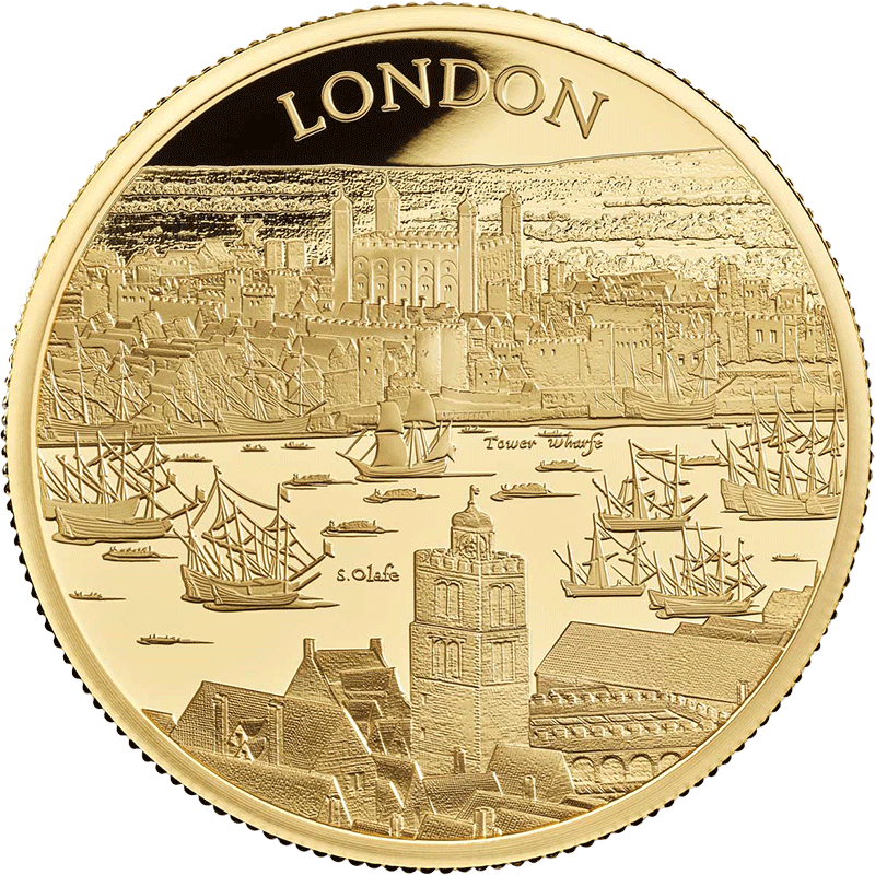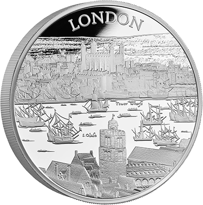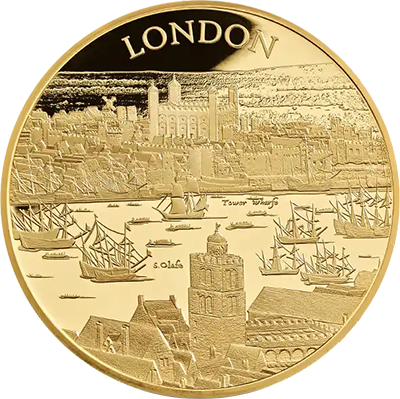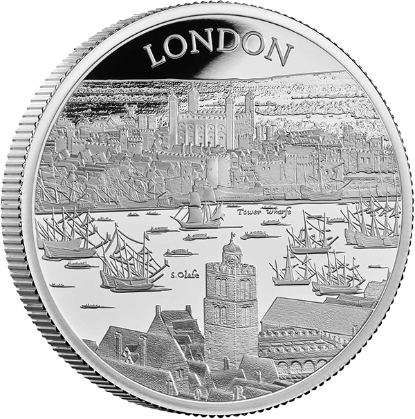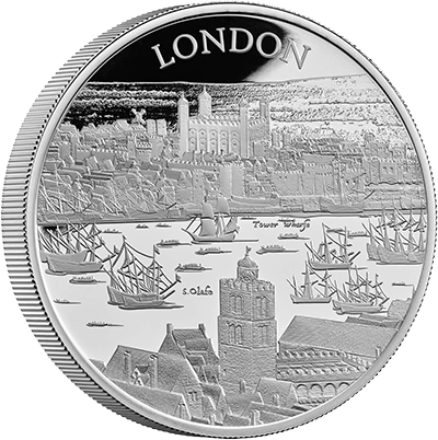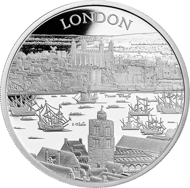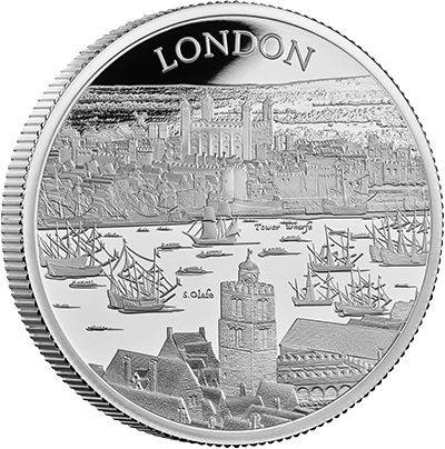 第1弾を飾るこのコイン裏面には、17世紀初頭のロンドンの世にも美しい景観が描かれています。テムズ川沿いに広がる見事な景色の魅力を伝えるこのデザインは、ステュアート朝の創設者ジェームズ1世の治世下のロンドンで頭角を現したボヘミア出身の芸術家、ウェンセスラウ・ホラーの風景画をオリジナルとしてコイン上に写し描いたものです。