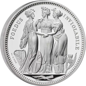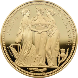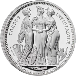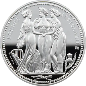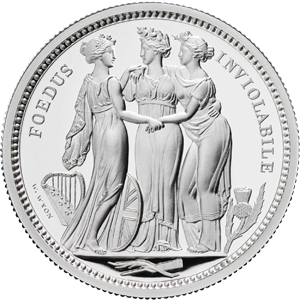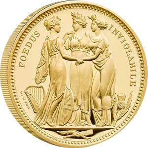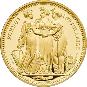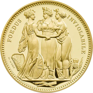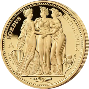 1817年に発表されたオリジナル版は、ナポレオン戦争後に荒廃していた英国の権威回復と英連邦三国の統一を三女神の優美極まりないデザインで表現したワイオン会心の秀作です。