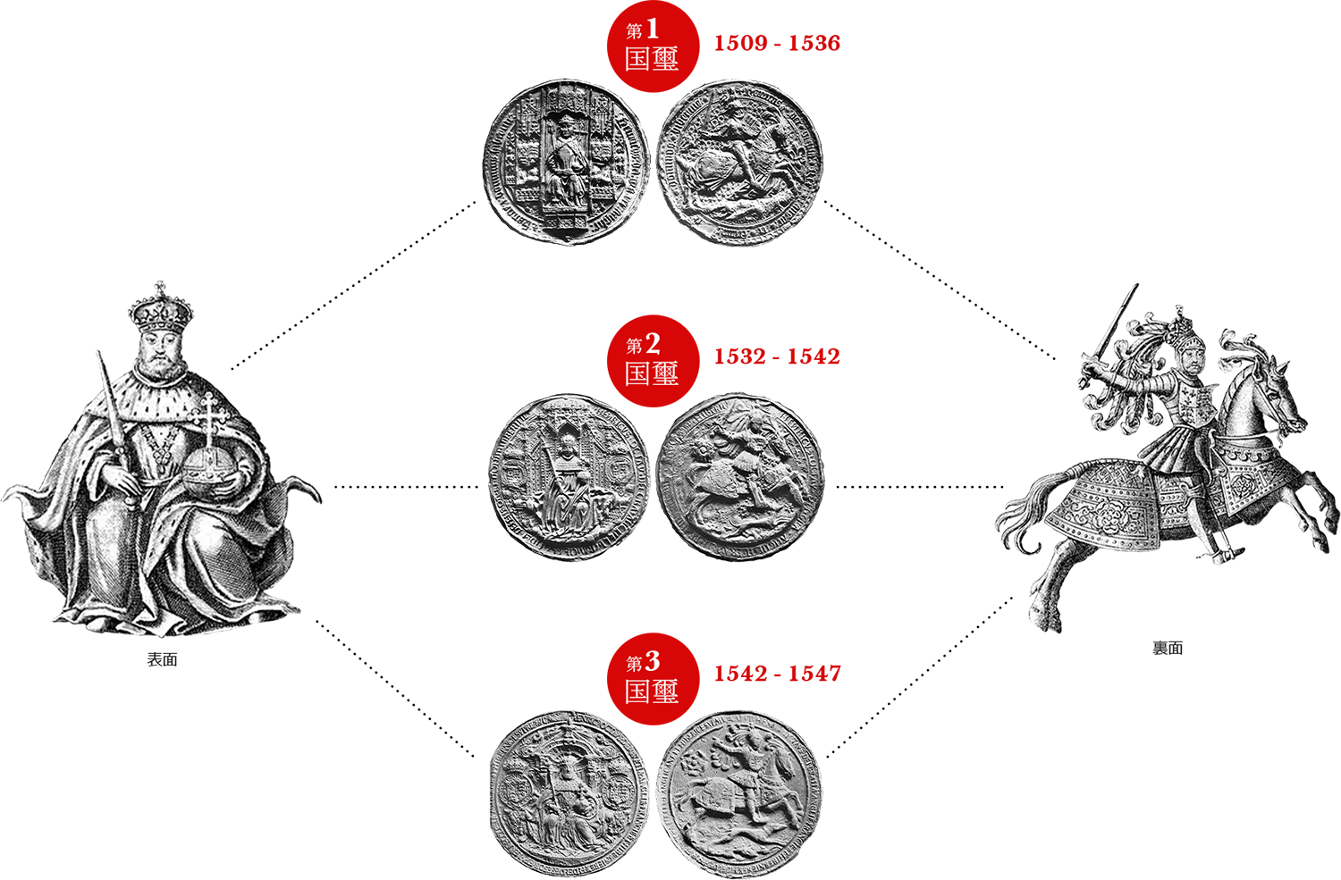 ヘンリー8世に限らず国璽は何度か作り変えられていますが、基本的に意匠は同じです。表面は王がローブを身にまとい王笏と宝珠を携えて玉座に着いている様子を描いており、裏面は王が戦士として馬にまたがっている姿が表現されています。