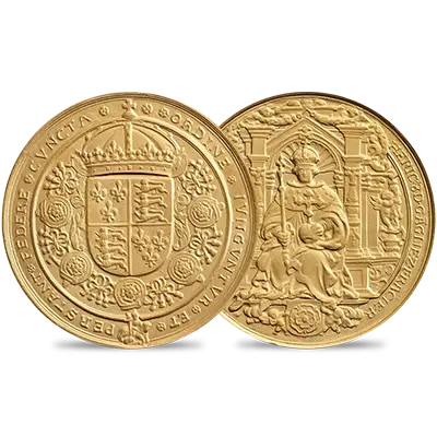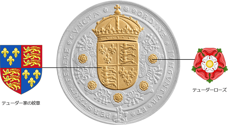 しかし今回復刻されたのはアミアン条約締結にあたって特別に作られた「ブラ」をモチーフとしているため裏面のデザインが異なります。中央にテューダー家の紋章と大きな宝冠、周りにはテューダーローズが5つ配されています。