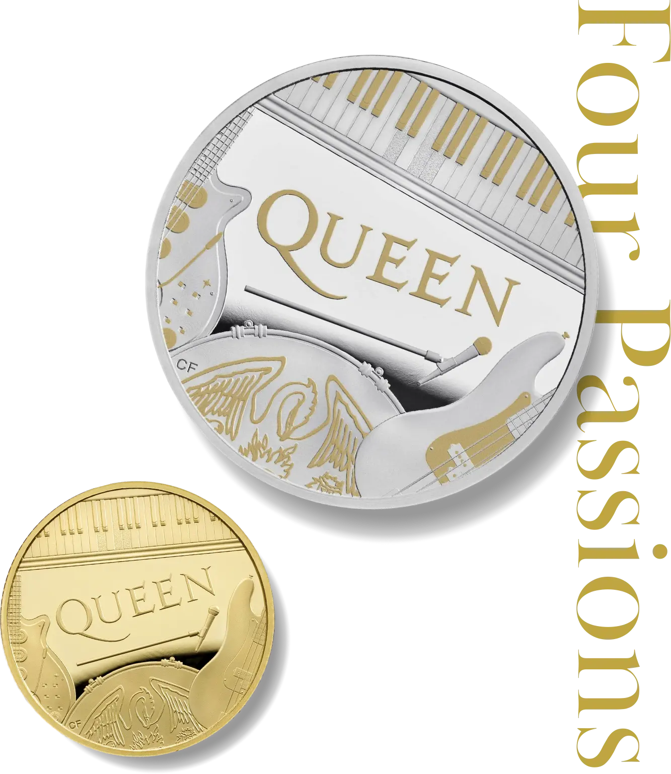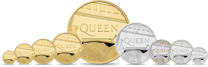 クイーンの音楽性と芸術的成果を最もシンプルな手法によって描き出す当コインの裏面には、「ボヘミアン・ラプソディ」の出だしの音が押されたキーボード、ベース、ギター、ドラムなど、バンドの主要な楽器がイラスト化され、担当アーティストの強烈な個性とプライドを強調しています。とりわけ裏面中央を左右に長く伸びるマイクは、長年メインボーカルとして活躍した今は無きフレディー・マーキュリーに捧げられるものです。その余りにも早すぎた死は、クイーンの名と共に永久に記憶されることでしょう。