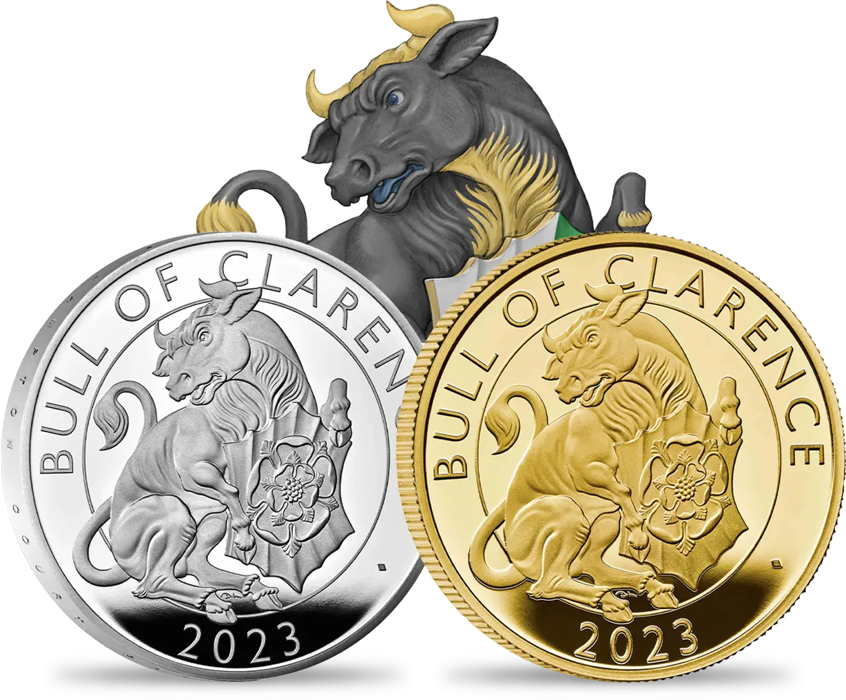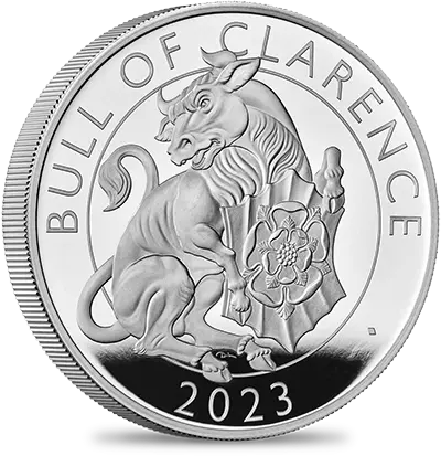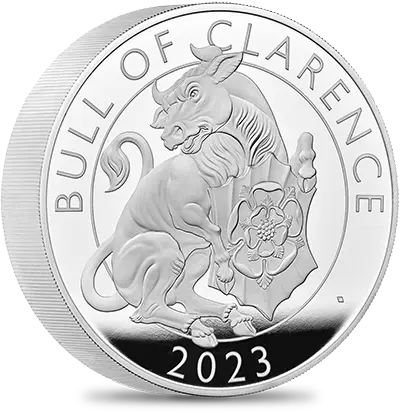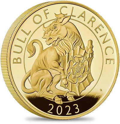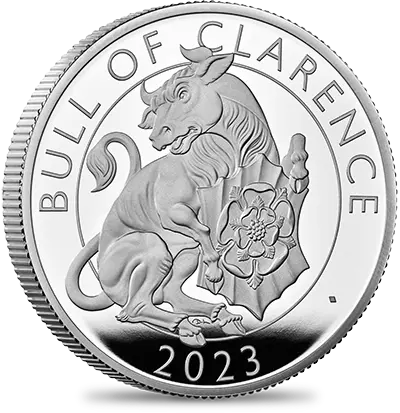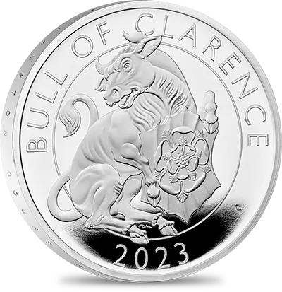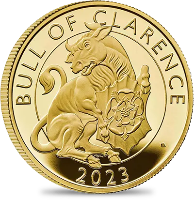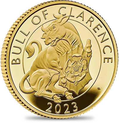 コインの裏面には、「クイーンズ・ビースト・コレクション」のデザインとはまた異なった角度からこの動物を捉えたデビッド・ローレンスによる躍動感溢れる現代的な解釈が見られます。牛の胸元には「テューダー・ローズ」の名称で知られる紅白の薔薇から成る古風な紋章が刻まれています。