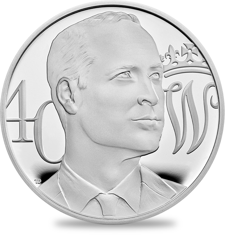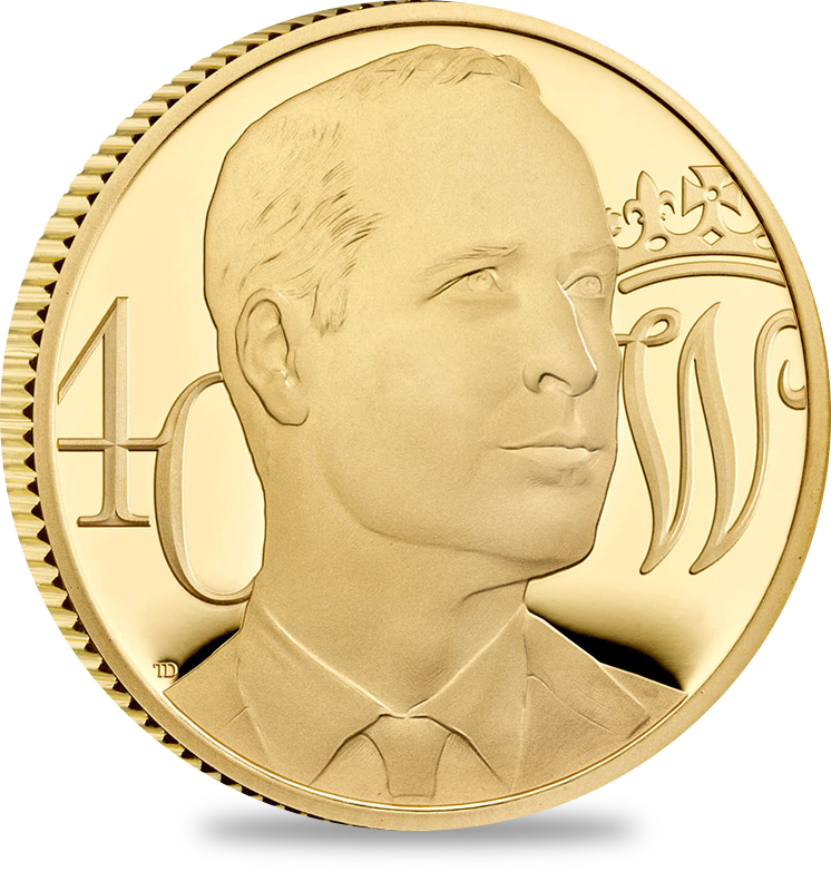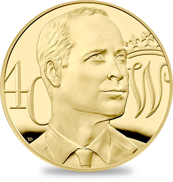 コイン裏面には40周年を迎えられた後も依然として若々しいウィリアム王子の颯爽たるポートレートが刻まれています。王子の肖像の左には40歳を意味する数字の40が刻まれ、右には王子の名ウィリアムのイニシャルであるWが印象深く刻まれています。